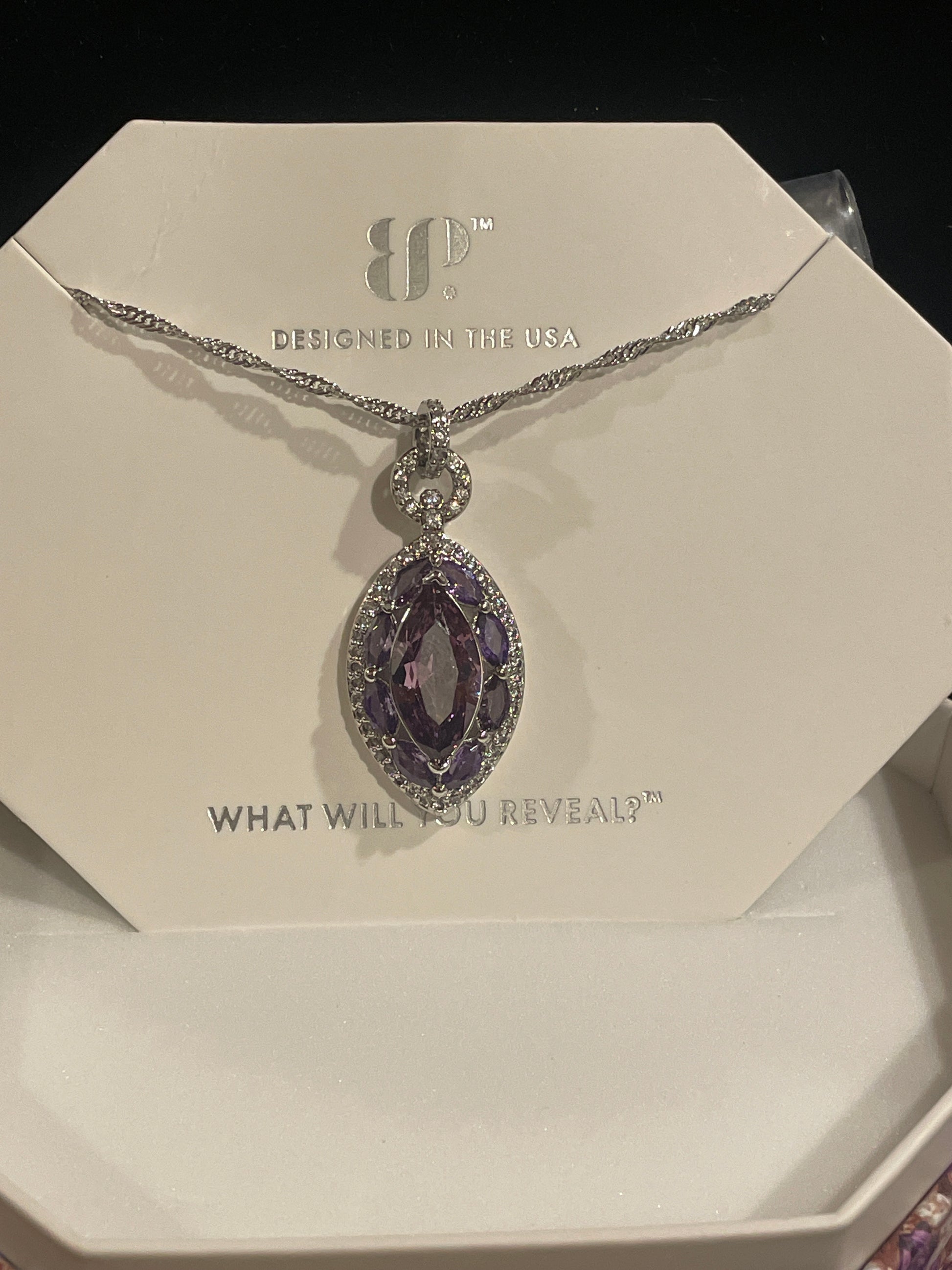 "Experience the incredible sparkle of this stunning necklace featuring Amethyst Cubic Zirconia on rhodium plating. Measuring 18 inches with an additional 2.5 inch extender, it will add a touch of glam to any outfit."