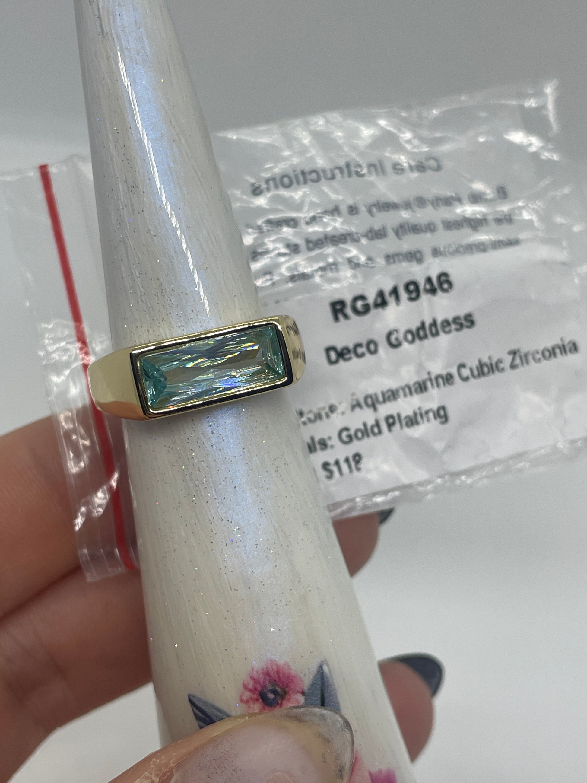 The Deco Goddess ring features stunning Aquamarine Cubic Zirconia set on a Gold Plating. This sleek modern piece is part of the March Collection, perfect for adding a touch of sophistication to any outfit.