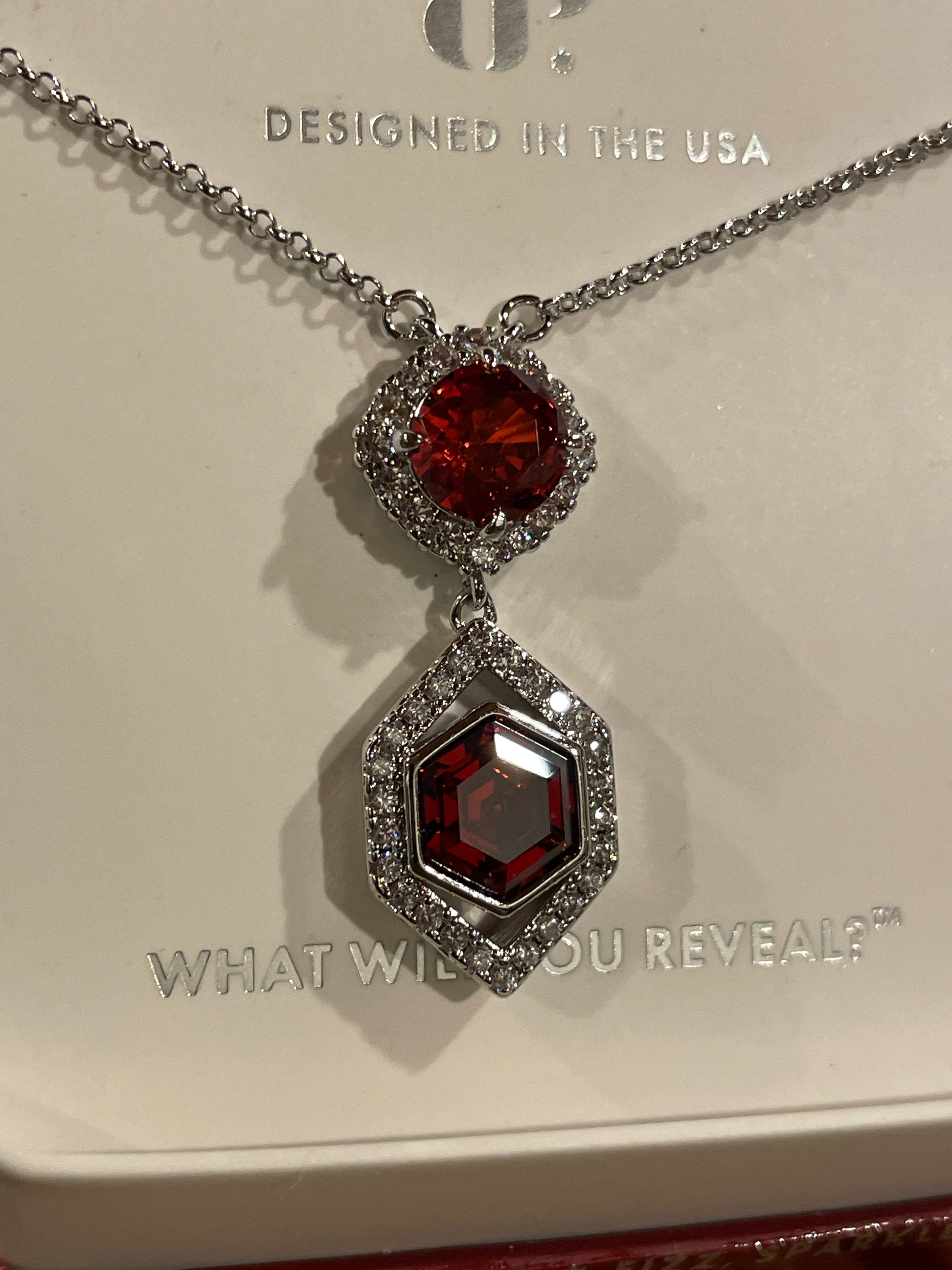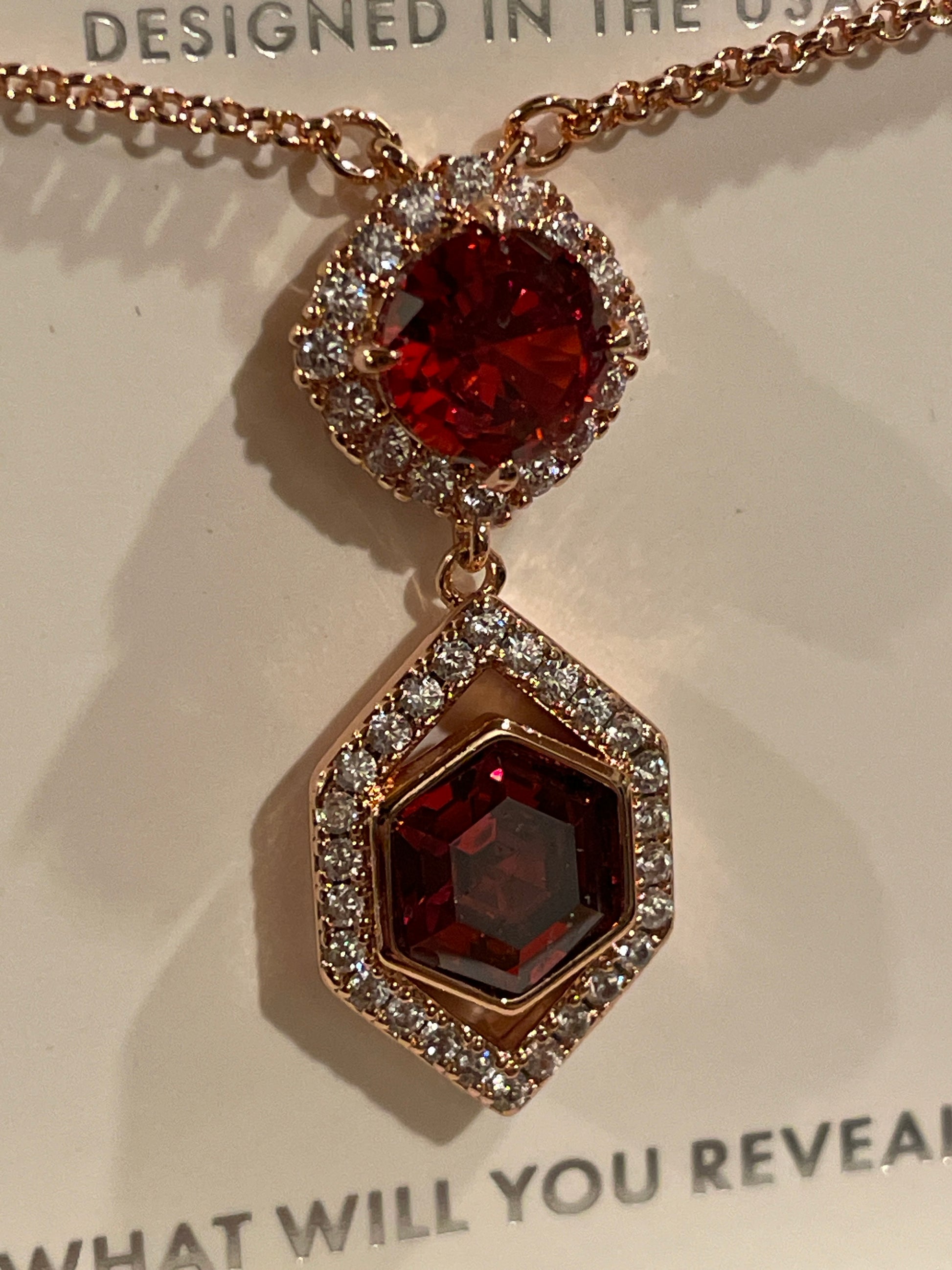 Indulge in luxury with Drops of Shimmer Garnet Necklace. The sparkling garnet and cubic zirconia stones, elegantly displayed on a rose gold plated chain, also available in Rhodium, will add a touch of glamour to any outfit. Elevate your style with this exclusive and sophisticated piece.